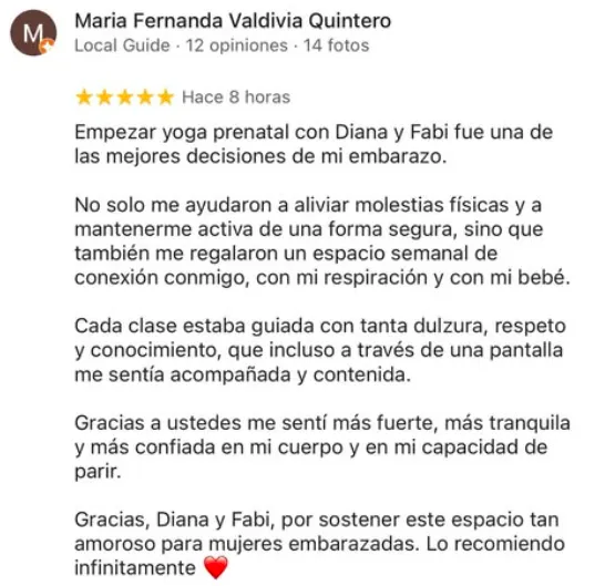 "Son lo máximo, no solo son clases de yoga, son acompañamiento de verdad. Diana y Fabiola gracias por crear este hermoso espacio lleno de una hermosa red de apoyo."